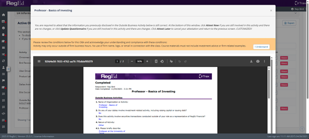 - Regulatory compliance: Firms can demonstrate their review process, not only upon initial approval but throughout the duration of the Outside Business Activity or Private Securities Transaction.